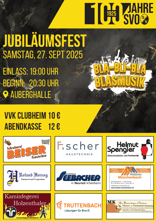 Anlässlich des 100-jährigen SVO Vereinsjubiläums wird am Samstag, 27.09.2025, die bekannte Stimmungsband „Bla–Bli-Bla-Blasmusik“ aus Oberharmersbach in der Auberghalle spielen. Beginn der Veranstaltung ist um 20.30 Uhr, Hallenöffnung um 19:00 Uhr. Für das leibliche Wohl ist wie immer bestens gesorgt.